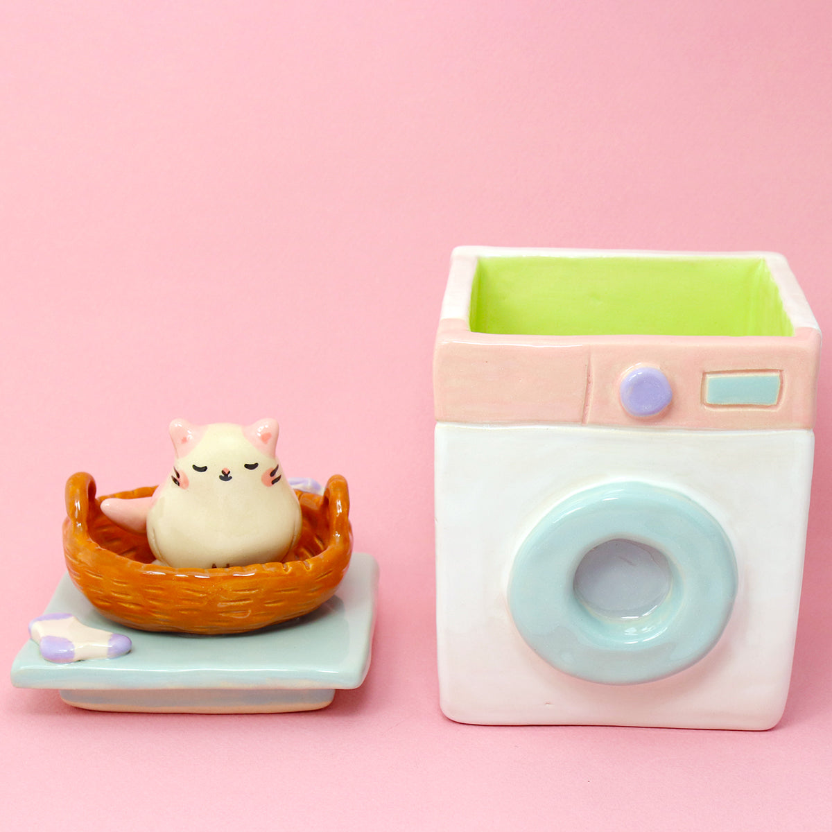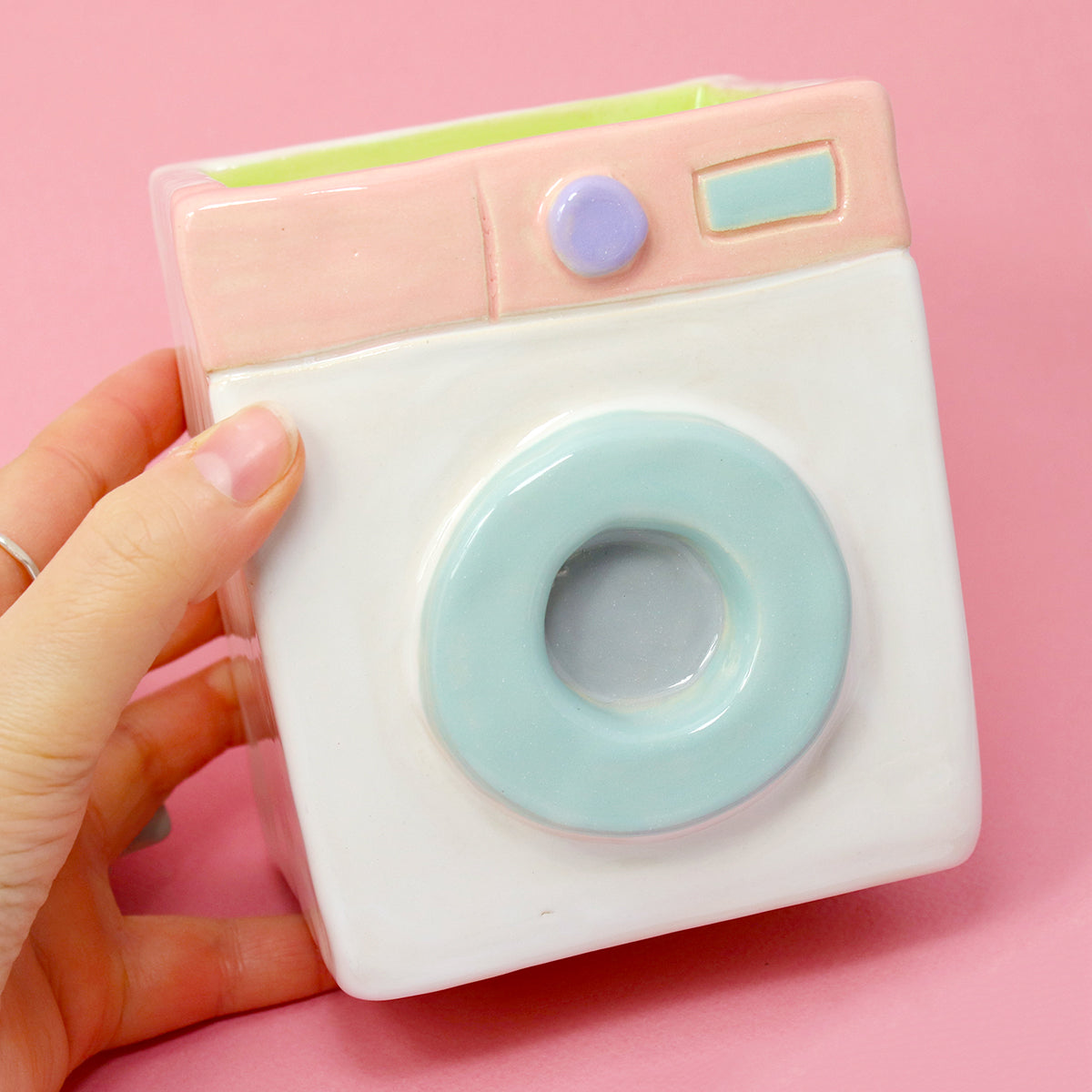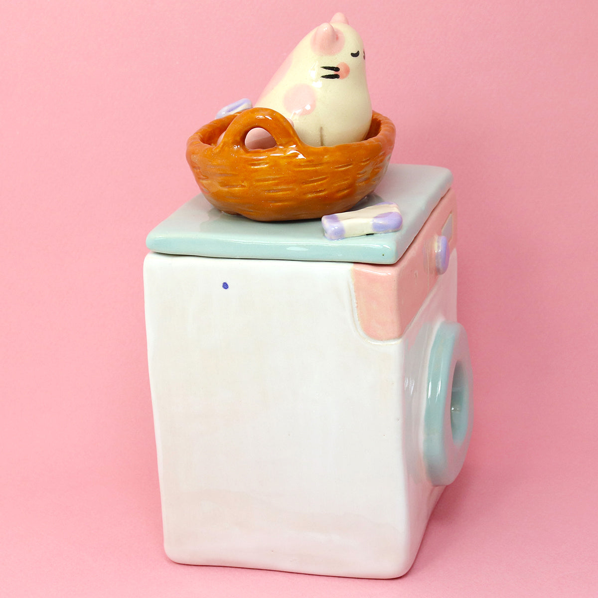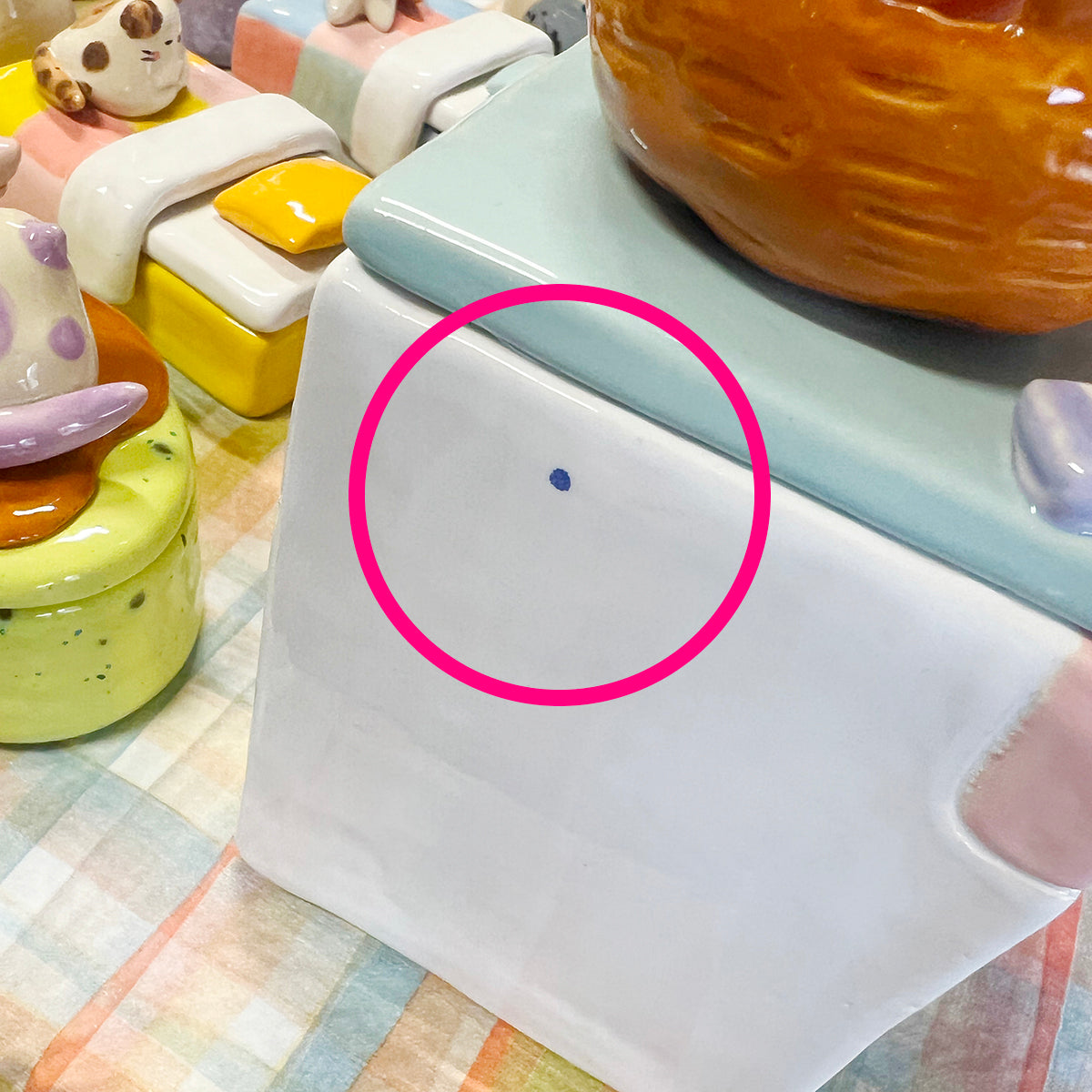 This piece is flawed, and is therefore lowered in price. There is a blue dot on the side of the washing machine and there are some tiny pinholes here and there. Honestly hardly noticable and still so cute! See last pictures for details :)