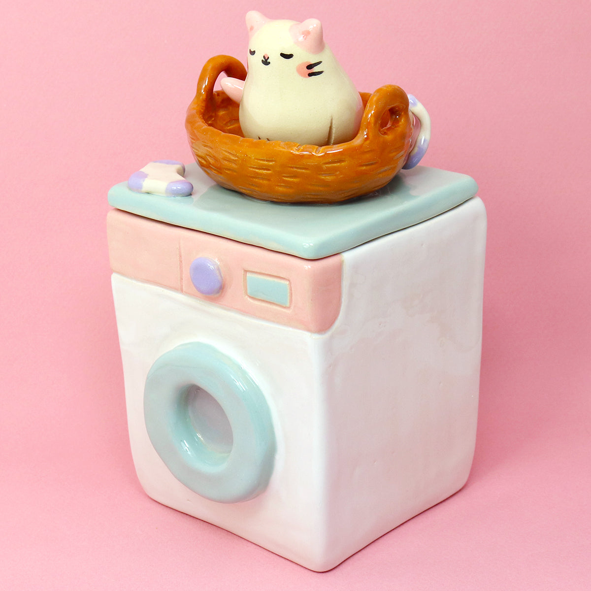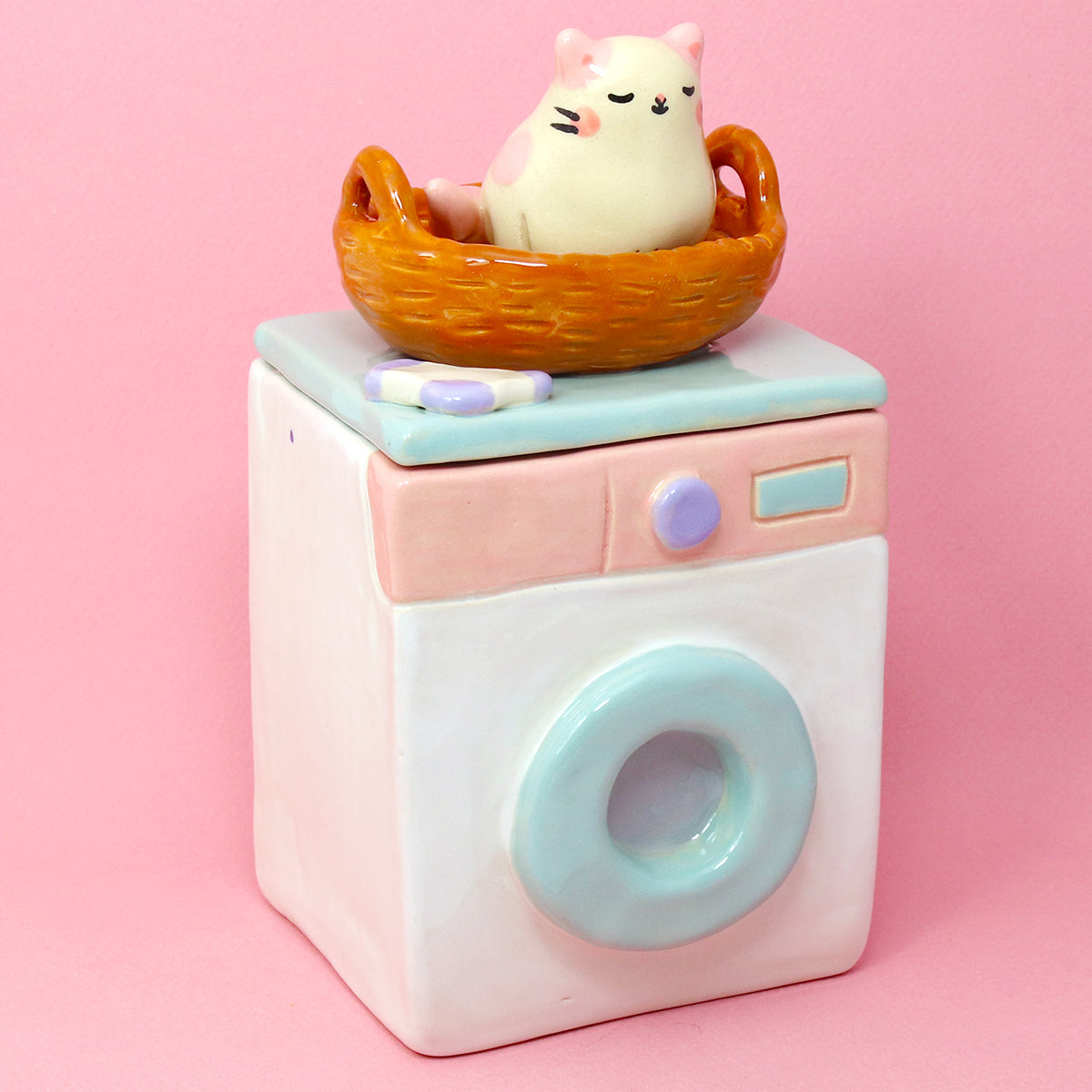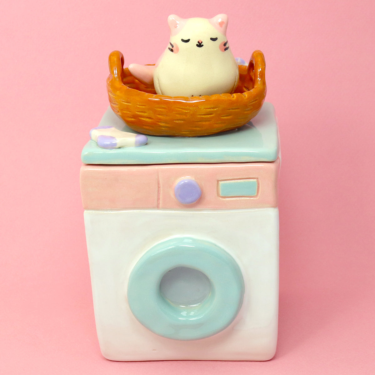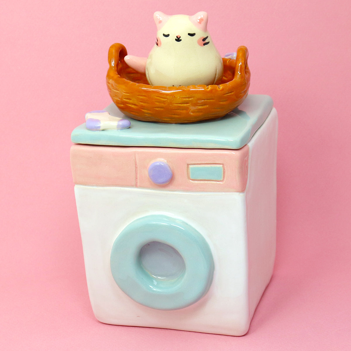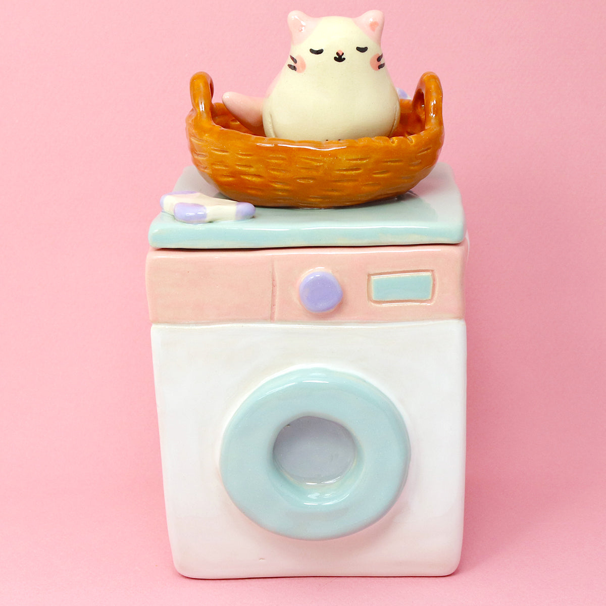 This piece is flawed, and is therefore lowered in price. There is a blue dot on the side of the washing machine and there are some tiny pinholes here and there. Honestly hardly noticable and still so cute! See last pictures for details :)