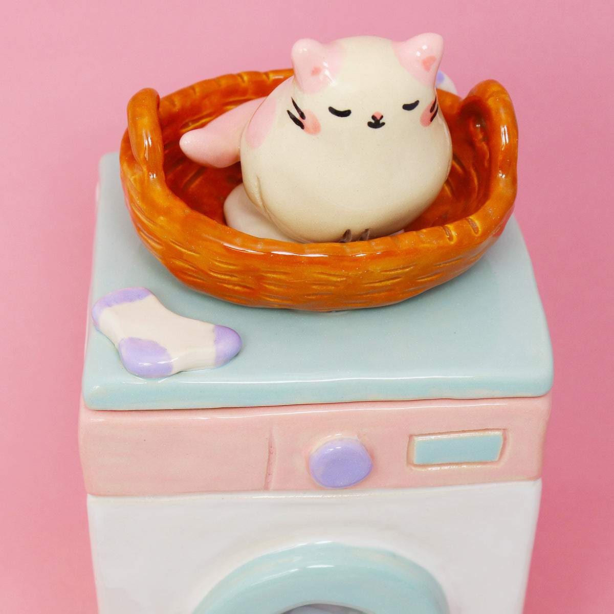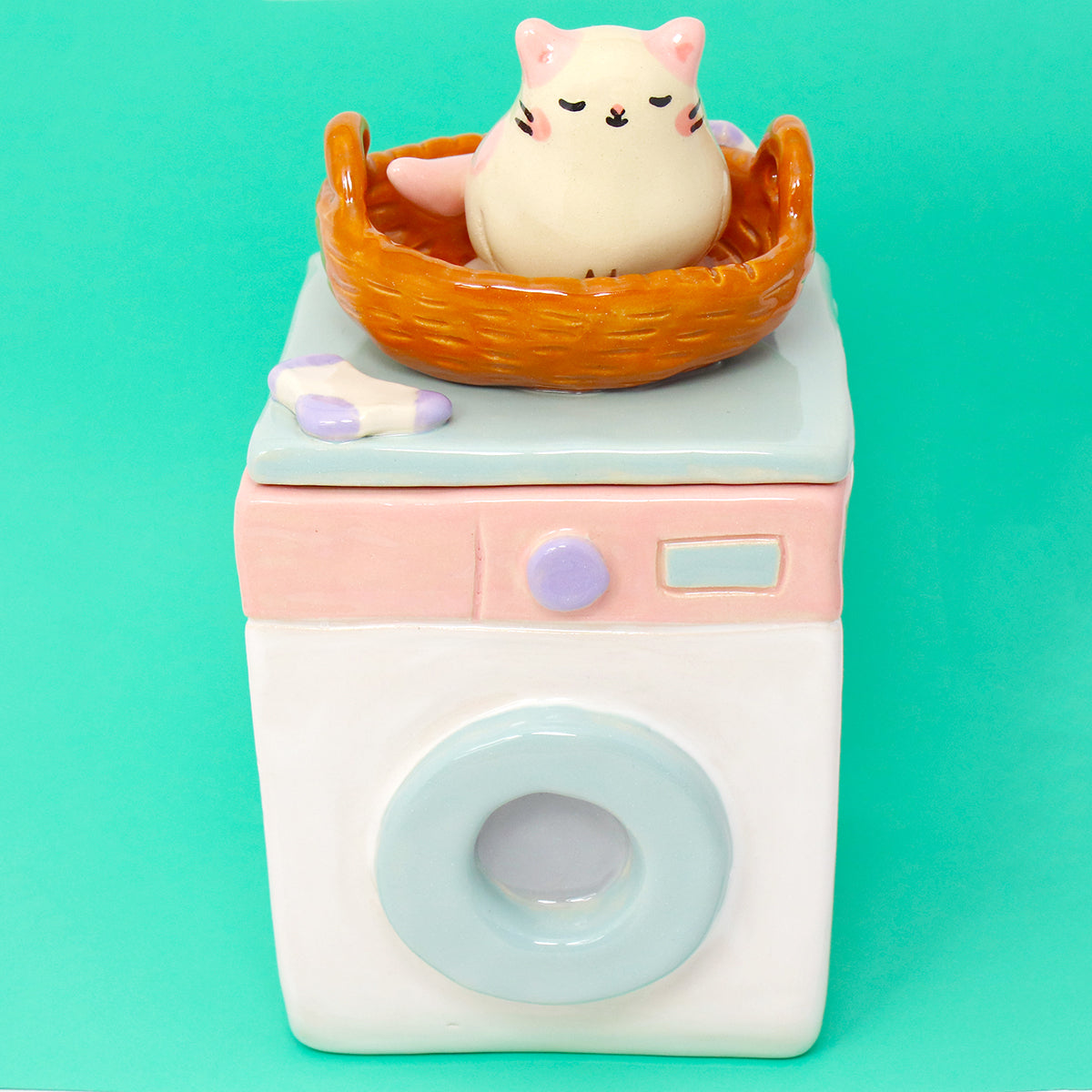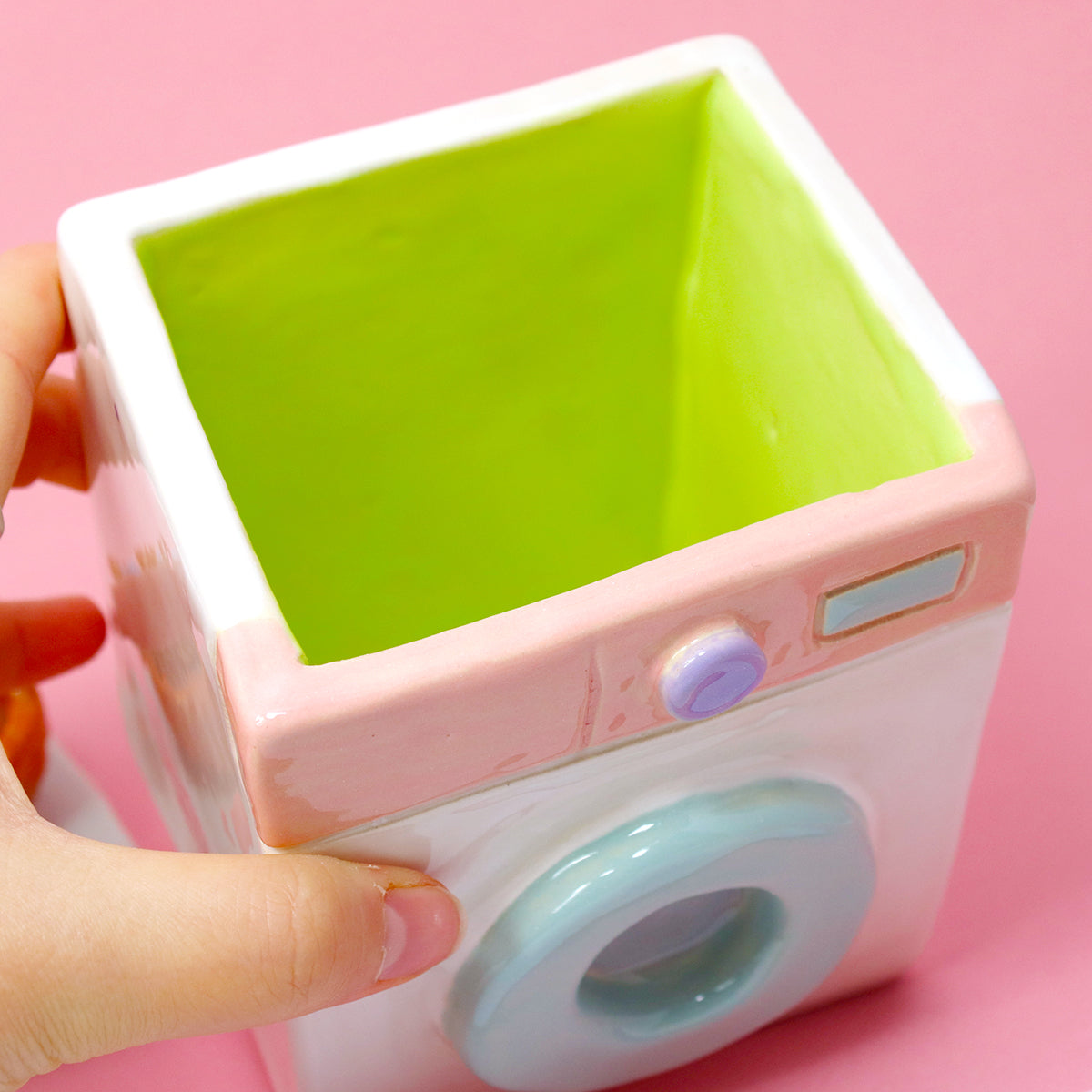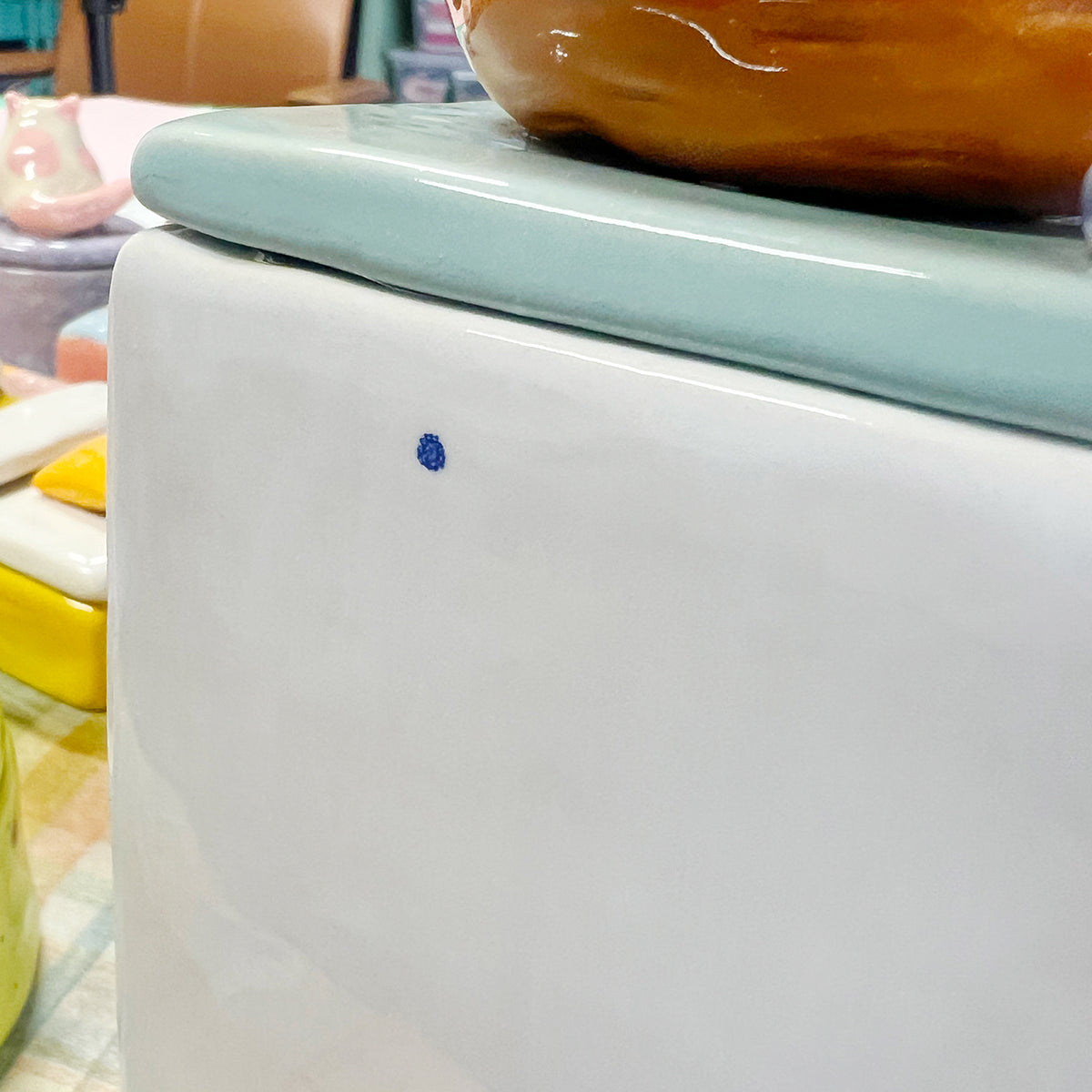 This piece is flawed, and is therefore lowered in price. There is a blue dot on the side of the washing machine and there are some tiny pinholes here and there. Honestly hardly noticable and still so cute! See last pictures for details :)